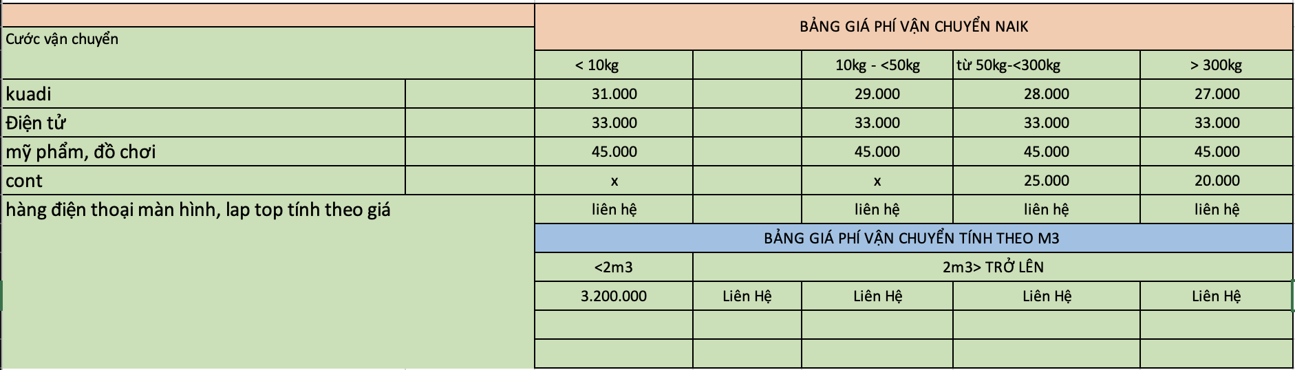 Phí giao nội địa Việt Nam: Từ kho Naik tại Việt Nam → địa chỉ khách (nếu khách chọn giao tận nhà, ví dụ qua Viettel Post).